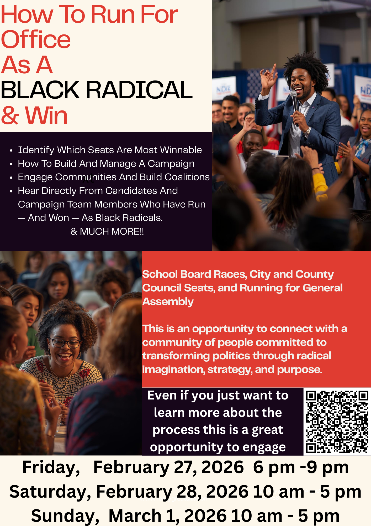 How to Run for Office as a Black Radical & Win is a hands-on training for Black aspiring candidates committed to building community-powered, values-driven campaigns. Learn how to identify winnable seats, manage a campaign, engage your community, and hear directly from candidates and teams who have run and won as Black radicals.